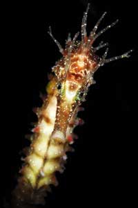 Dimanche 18 mai 2008, une petite plongée de réadaptation est prévue: une mise à l'eau du bord, à la presqu'ile de Giens me permettra de me refamiliarier avec mon matériel et tester de nouvelles techniques. Quelle ne fut pas ma surprise de tomber nez à nez, sur un fond sableux de 5m de profondeur, à la sortie d'un port (oui, j'aime vivre dangereusement!!!), sur cet étrange animal semblant tout droit sorti des profondeurs abyssales: Uranoscopus scaber. Encore une fois la chance m'a sourit, et ce qui ne devait être qu'une plongée de réadaptation est devenue une plongée macro splendide! Vous trouverez ici la fiche détaillée de ce poisson (fiche récupérée sur le site DORIS) ainsi qu'une galerie photos.